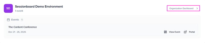 After logging in, click “Organization Dashboard" to access your event's organization: