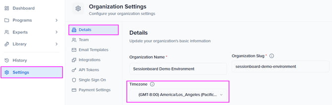 Also, verify that the timezone matches in both events before syncing. To do this in Sessionboard, go to the Details page, then confirm a timezone.