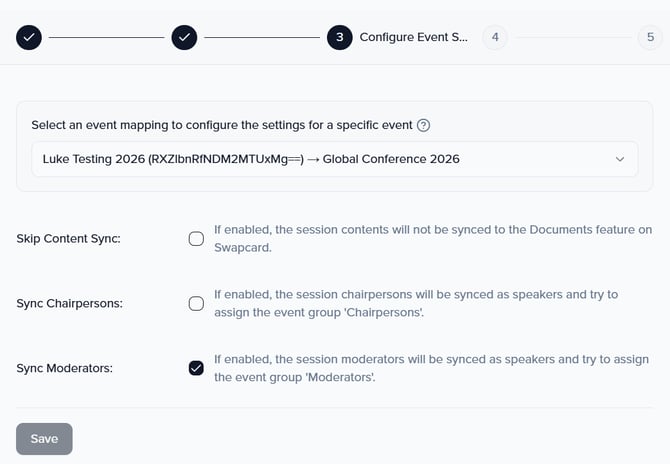 Once your event is connected, you will be able to identify if you would like to include 'Moderators' & 'Chairpersons' in your sync. Speakers will natively sync, but this will allow you to include your 'Moderators' and 'Chairpersons' if you choose to.