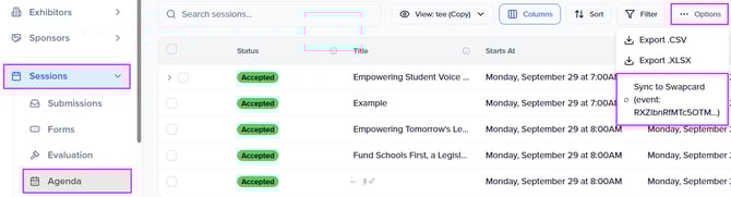 Before initiating a sync, ensure that you have reviewed and accepted the sessions that you want to sync to Swapcard. Sessions must have a date and time to be synced.