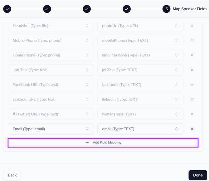 Once your session fields are mapped, you will then be prompted to map your speaker fields.