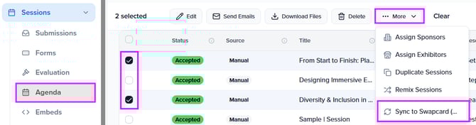 In addition to syncing all sessions and their speakers, you have the ability to choose individual sessions to sync. This can be done under the Sessions > Agenda tab and by selecting the individual sessions you wish to sync. You will want to select your session(s) and then under 'More' click 'Sync to Swapcard'.