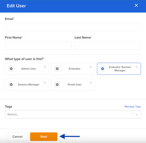 💡NOTE: If the user is a Session Manager or Evaluator Session Manager, you will be instructed to select the Next button to assign them a filter.