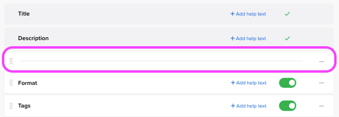 Hover between fields and click the blue + icon to insert a section header, add a divider line, or insert a rich text box.