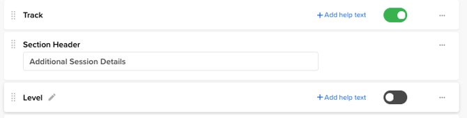 Session Information - Collect information about the submitted session by adding a page title, page description/instructions, as well as questions to collect data.