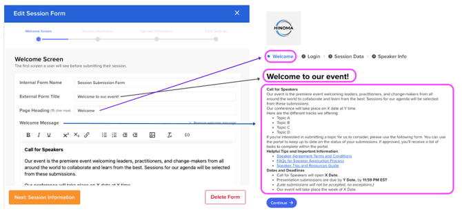 Speaker Information - Collect information for the session's speaker(s) by adding a page title, page description/instructions, as well as questions to collect data.