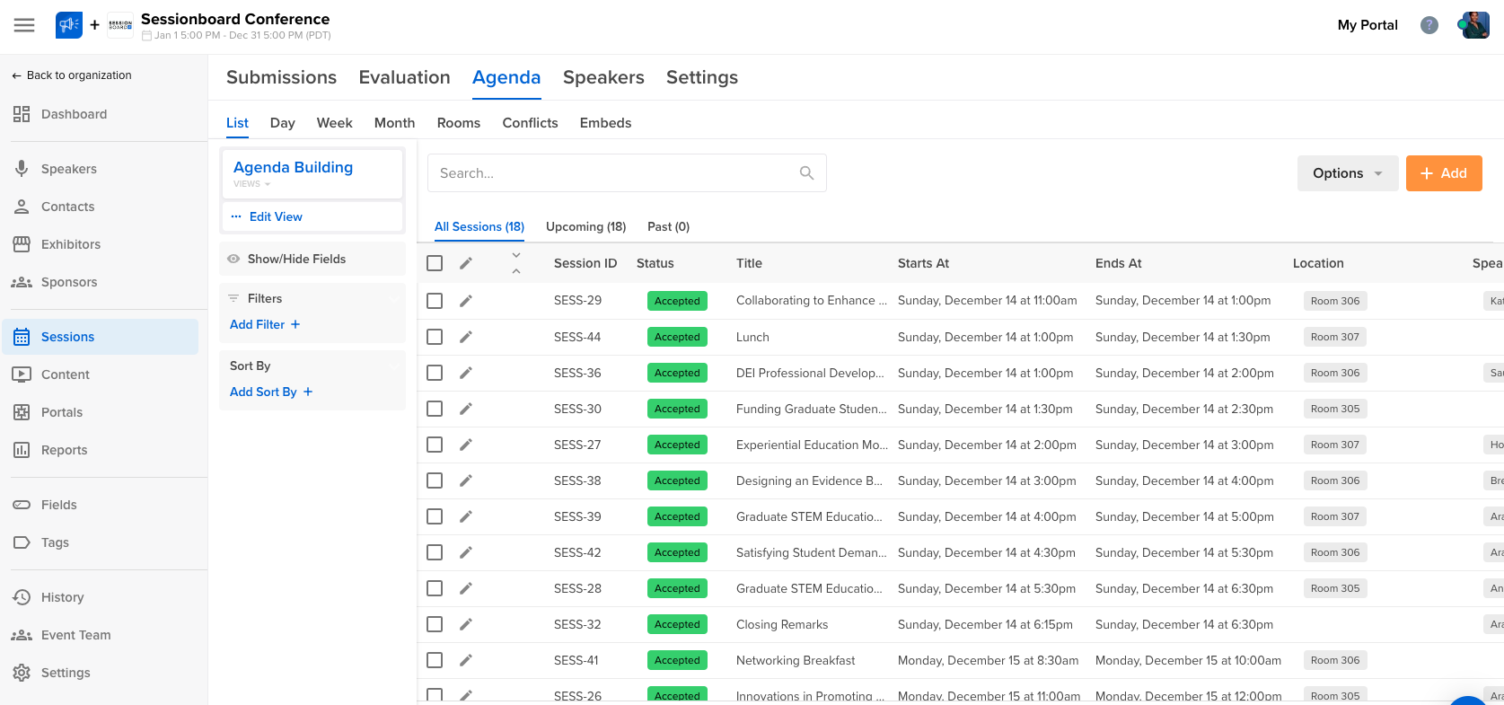 - Session Statuses: Allows event teams to manage and schedule sessions with a variety of statuses, not just those that are accepted. In the example above, only sessions with the statuses “Accepted” and “Accept Queue” are included in the agenda view.