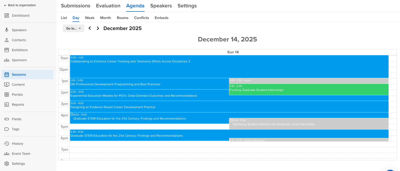 Use submissions to build your event schedule. A session can be a submission you have accepted or any other event day scheduled times you want to show to your attendees (i.e. Lunch, Networking Hour, Registration Open).