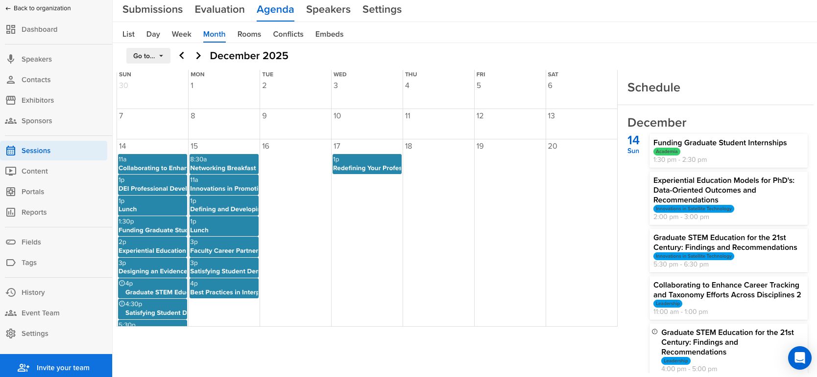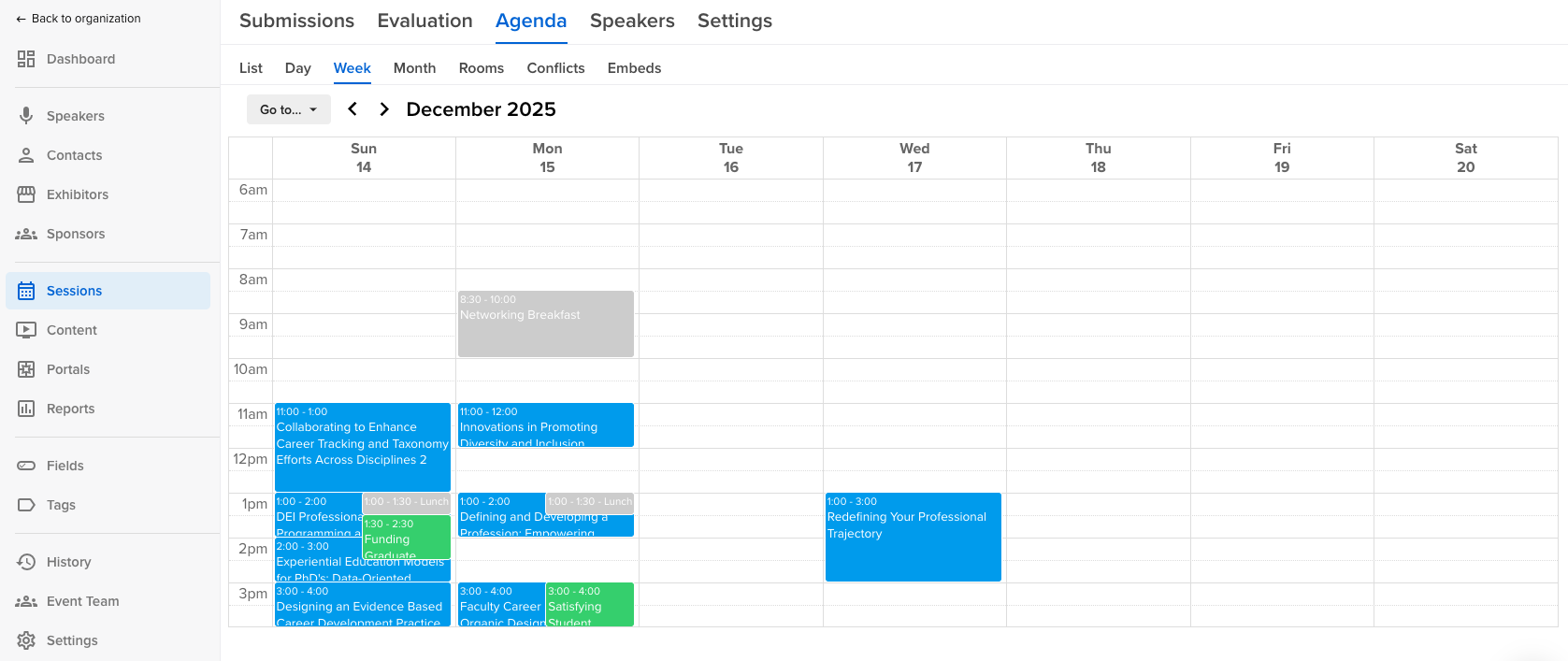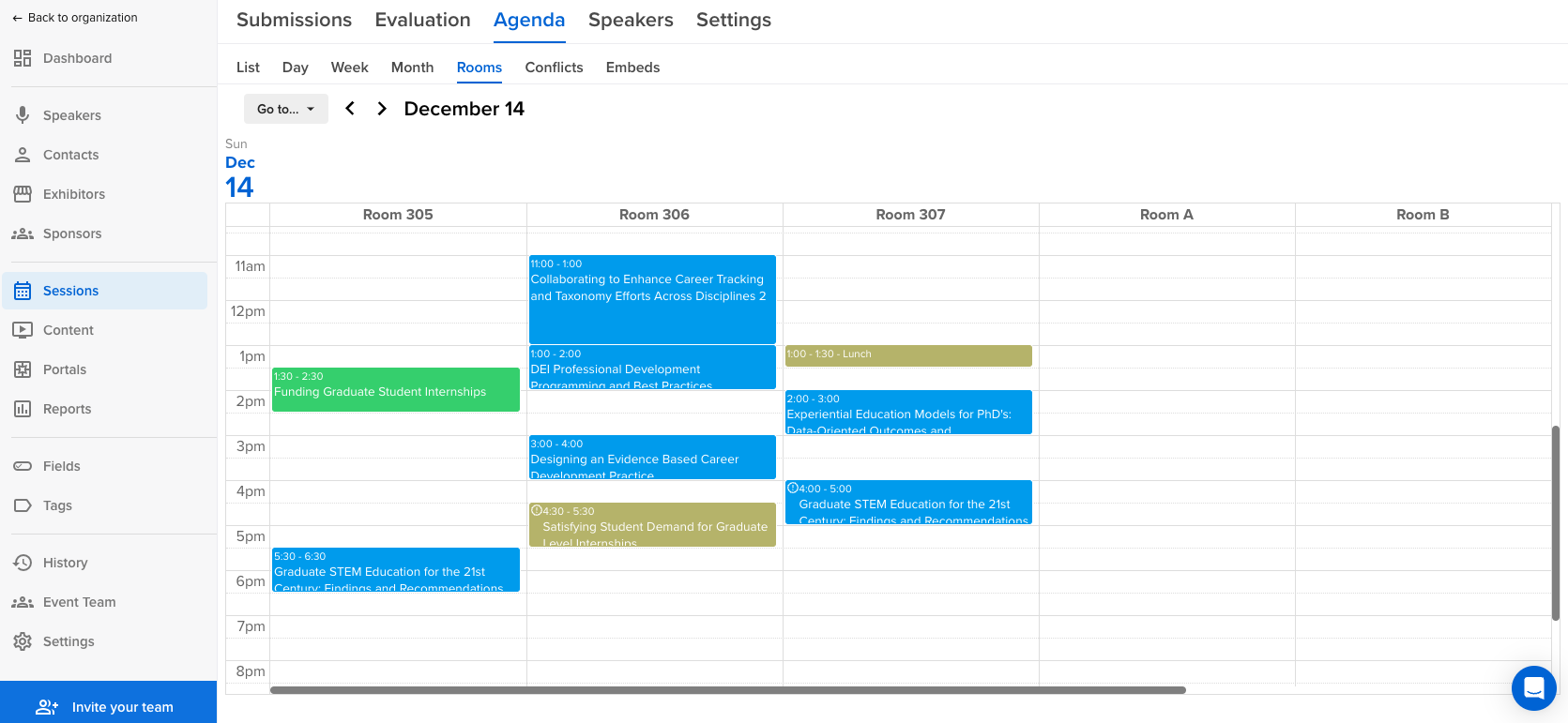 You can drag and drop all accepted sessions to update and assign the date, time, or room, depending on the view you are in.