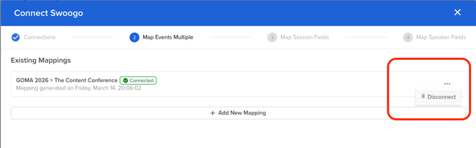 Disconnecting the integration will disconnect all mapped events. Previously-synced sessions will not be able to be resynced even if you remap the same events. The integration should only be disconnected if you intend to sync to a new organization.