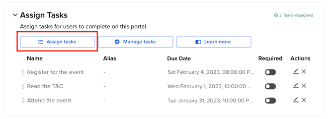 Required: Tasks can be marked as required by toggling ON this button. This action can also be done from the portal's main menu.