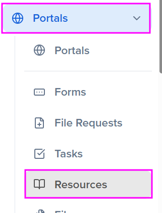 Navigate to the Portals module and select "Resources" at the top of the page.