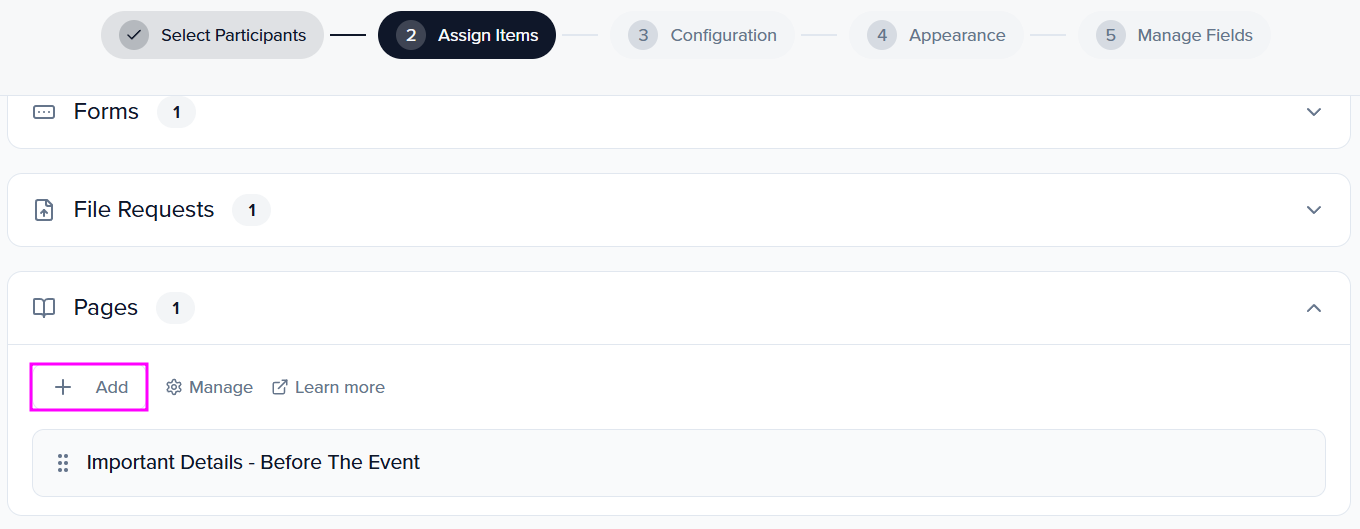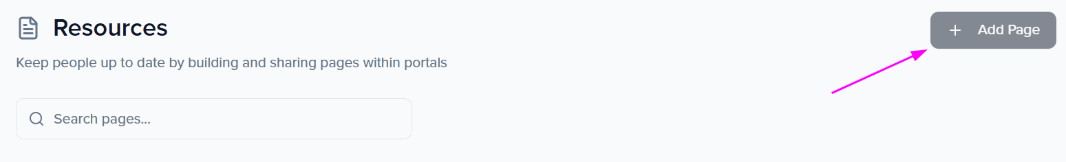 Within the Pages widget, select the Add button to open a pop-up module. This will show any resources you have created to select and assign to your portal.