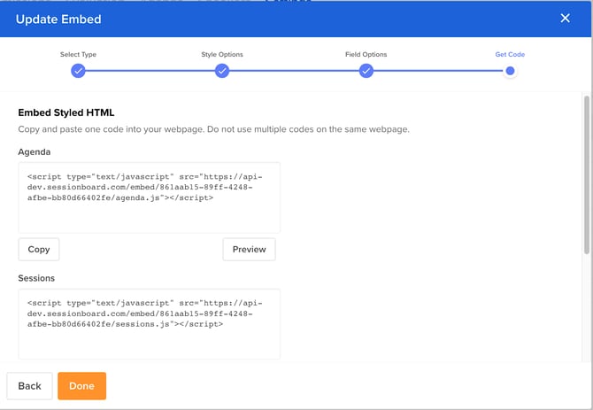 Embed Styled HTML: One line of JavaScript code that you can put on a website to display an interactive agenda, session list, or speaker list.