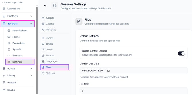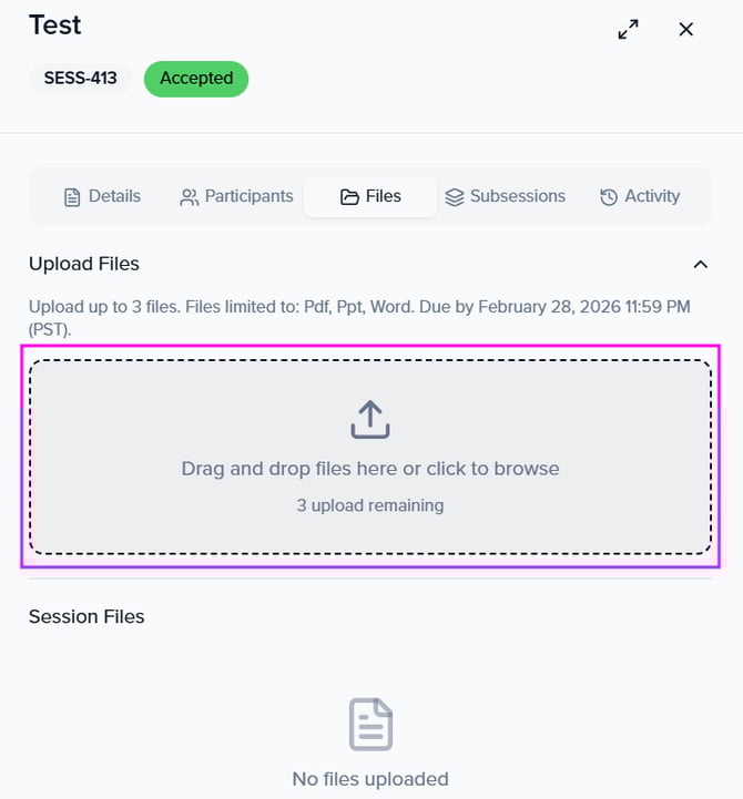 Files can be uploaded to a session by any speaker who has portal access or an event administrator.