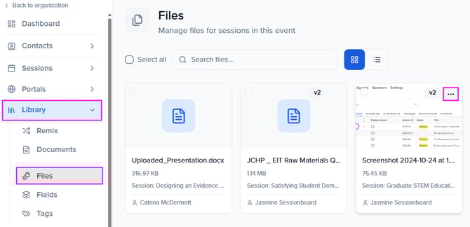 Admins can upload content at any time by clicking the pencil icon to the left of a session and then selecting the tab Files.