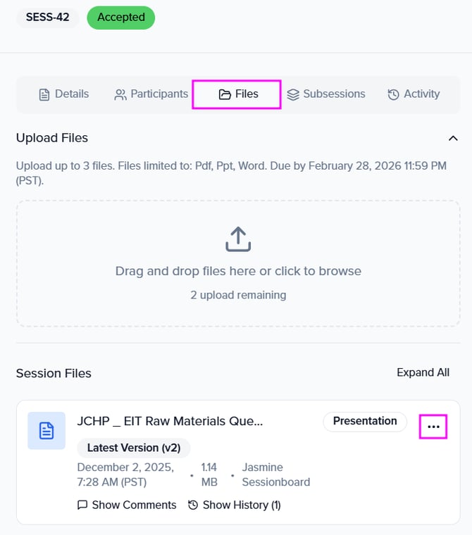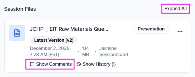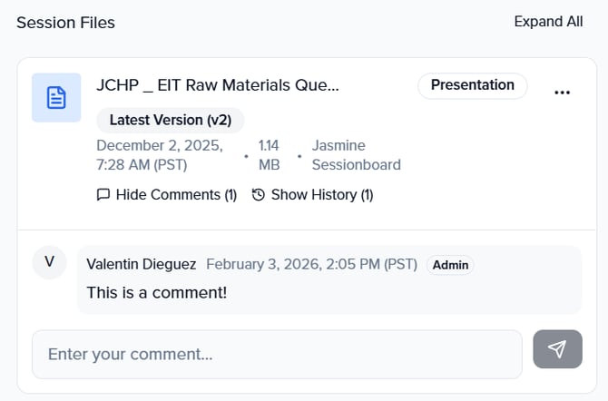When a file is uploaded to a session, the session speakers and admin users can add comments to communicate with each other.