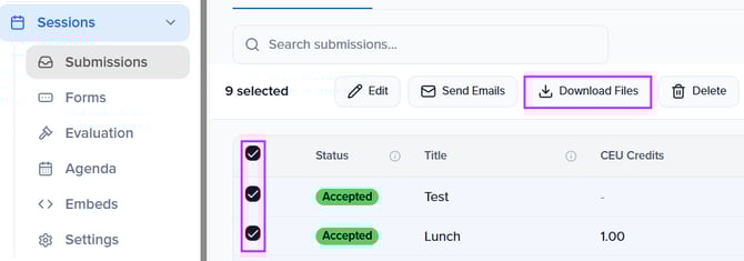 Navigate to the Sessions module and select the session(s) you would like to download files for.