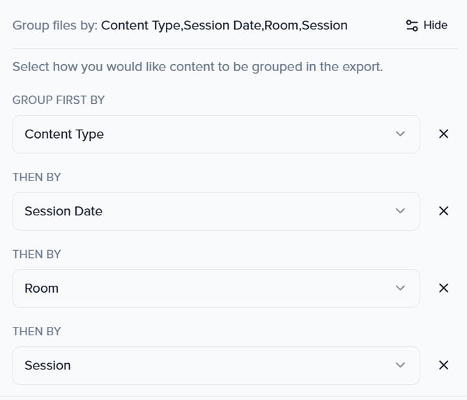 Note: The latest version of all session files is included in the exported file. Files can be deselected if they should not be included in the file. Previous versions cannot be included in a file and must be downloaded directly from the session content tab.