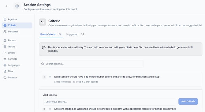 Agenda Settings, Criteria, Personas, Rooms, Tracks, Tags, Levels, Formats, Languages, Fields, Statuses