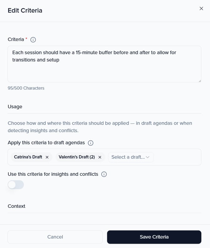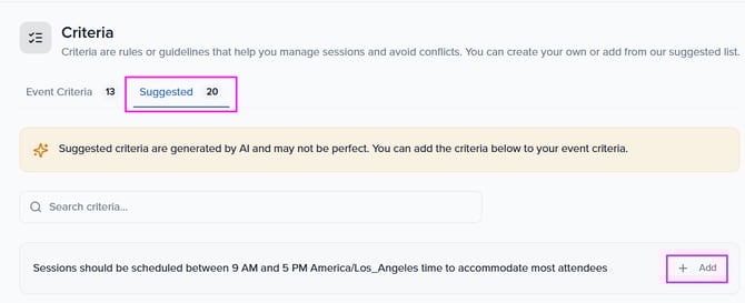 Suggested criteria are generated by AI and may not be perfect. You can add the criteria to your event criteria by selecting the plus icon.