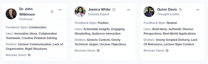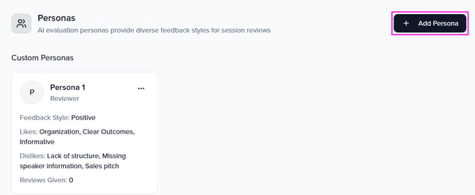 Personas are AI-powered virtual evaluators designed to review your sessions from a variety of perspectives. Each persona is tailored to reflect a specific role, audience type, or area of expertise—such as a technical expert, first-time attendee, or executive decision-maker.