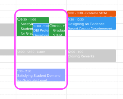 - Session Statuses: Allows event teams to manage and schedule sessions with a variety of statuses, not just those that are accepted. In the example above, only sessions with the statuses “Accepted” and “Accept Queue” are included in the agenda view.