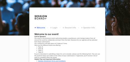 Hello, and welcome to Sessionboard! We are excited to work with you. This checklist is your one-stop shop for having a successful event. Use the steps associated with the modules you have access to as a guide through your event execution. As always, if you have any questions, please contact support@sessionboard.com.