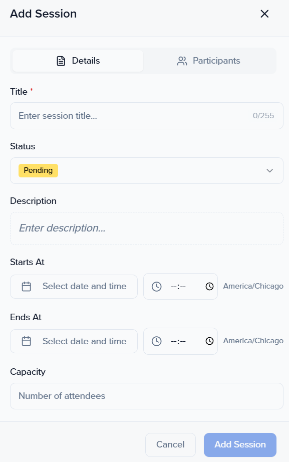Once you are done, click the "Add Session" button at the bottom right-hand corner of the pop-up window.