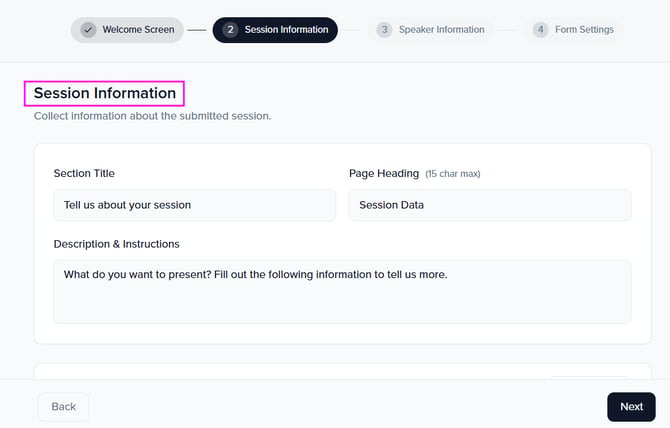 Session fields are used when creating your session submission form on the page "Session Information". These are fields that relate back to the session such as: