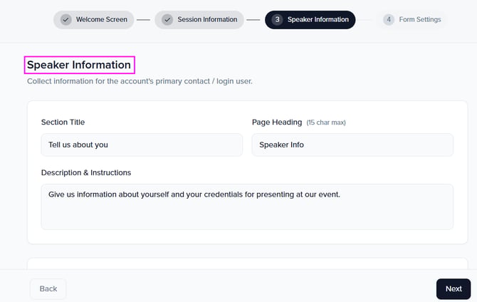 Speaker/Individual fields are used when creating your session submission form (on the page "Speaker Information"), Intake Form (on the page "Contact Information"), or portal form. These are fields that relate back to the speaker contact profile, such as: