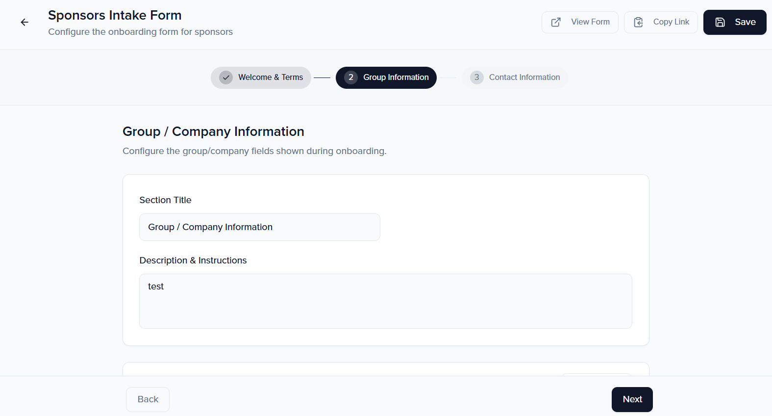 Group fields are used when creating your sponsor/exhibitor intake form (on the page "Group Information") or portal form. These are fields that relate back to the group (i.e. sponsor and exhibitor organization) such as: