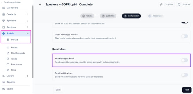 Send an automated email to session speakers, exhibitors, and sponsors when a new task (i.e. task, form, or file request) is assigned to their portal.