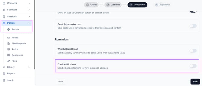 IMPORTANT NOTE❗️: Admin users are not able to disable notifications at the time. Backend users who have access to Portals Tasks (see image below) will receive these emails.