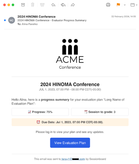 When enabled, Evaluators who are assigned a specific evaluation plan will receive an email from Sessionboard on Mondays at 7 AM UTC informing them of their plan progress, as well as the number of submissions that have not been reviewed