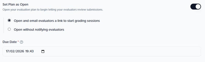 - When it is time to open an evaluation plan, you can open and notify evaluators by sharing a link to log in/create an account to access their assigned Evaluation Plan.