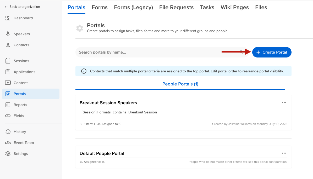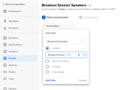 Admins can create custom portals using filters to control who is assigned, allowing you to dynamically tailor the portal experience based on specific criteria such as contact role (Speaker vs Moderator), session type (Breakout Session vs. Keynote), or sponsor tier (Gold vs. Silver), to name a few. This ensures users are only seeing information relevant to them