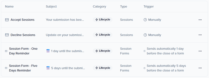 Note: Sessionboard provides a standard "Accept", "Decline", One Day Reminder", and "Five Days Reminder" email templates that can be customized for your event use.