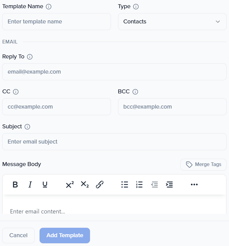 ❗IMPORTANT: If you change a template module after you begin typing the message body, the current merge tags will not be valid. Please ensure to reapply your merge tags as they differ per module.