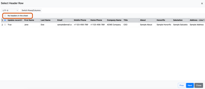 Select if your file has a header or not to continue with the importing process. Once completed, select the blue 'Next' button at the bottom right-hand corner of the screen.