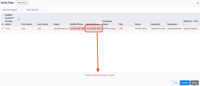 Phone numbers (i.e., Mobile Phone & Home Phone fields) must be in the following format: +1 (123)456-7891