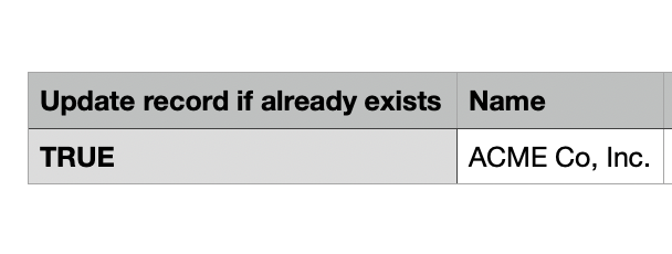 - In this column, enter TRUE for all records/rows you wish to update. Delete any records/rows you do not wish to udpate.