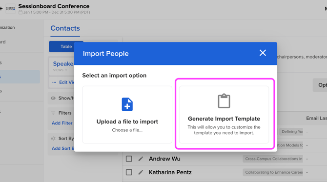 Within the pop-up model, select the option to Generate Import Template. Templates will automatically download to your device as a CSV file.