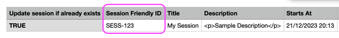 When using the Sessions module import template, do not add data to the column Session Friendly ID. Session IDs are assigned to new sessions upon import/creation. This field can be utilized if you wish to import data to update existing sessions.