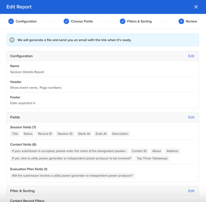 Contact Reports combine session, contact, and sponsor/exhibitor data into a single report.