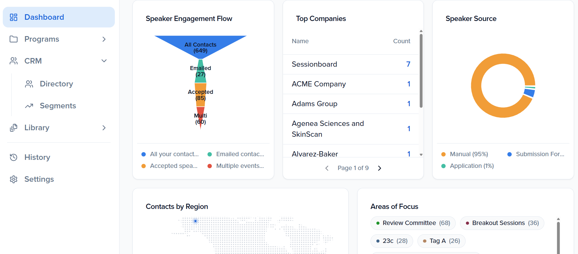 The dashboard provides a summary of your organization’s event and contact activity, including total events, contacts, accepted speakers, and returning speakers. It also offers quick-start tools to manage events, import contacts, explore speaker topics, and create segments.