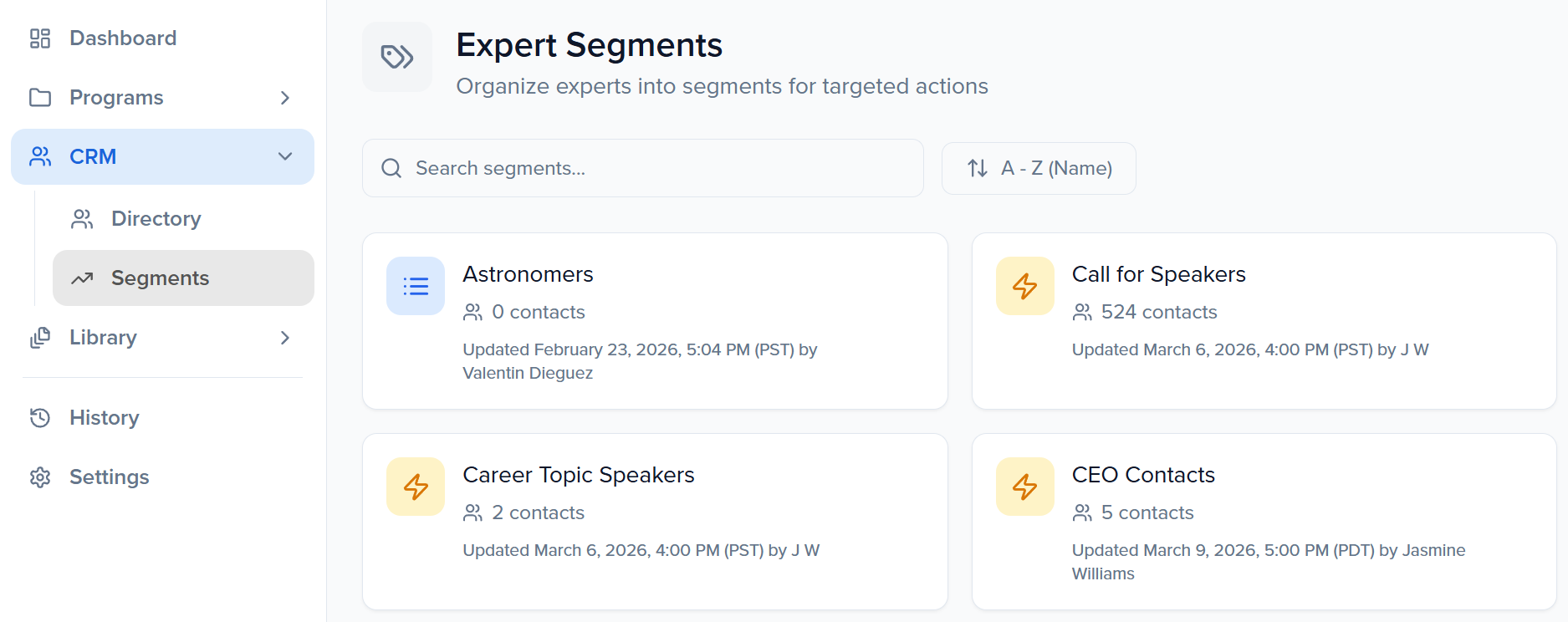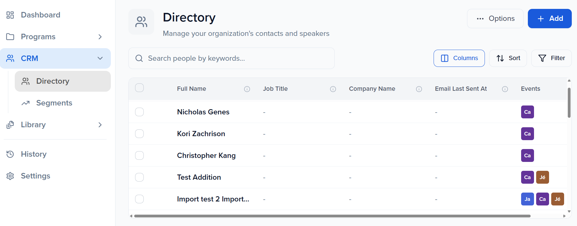 A CRM is a customer relationship management software that is meant to provide deep transparency into and maximize your network, improve communication, and reduce the time it takes to discover the ideal speaker for each event and activation.