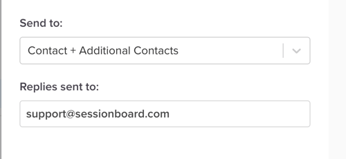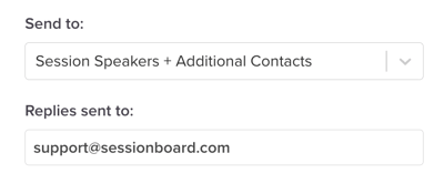 2. Within the pop-up window, select Session Speakers + Additional Contacts within the field Send to: and add the email address to which replies will be redirected (Replies sent to:).