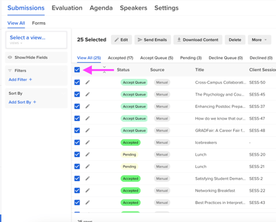 • To send an email to more than one session, select all of the sessions you would like to email or click the first square to select all sessions within the page.