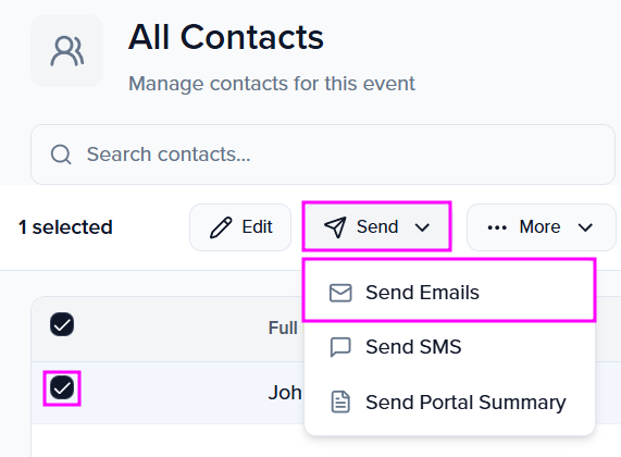 Example: If John is an additional contact for Arabella and you want to email John, you must first select Arabella to initiate the email process.